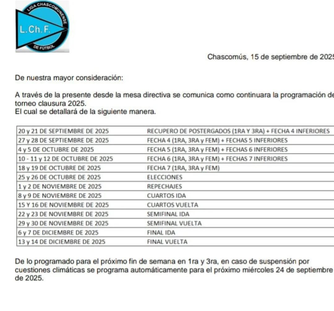 Este miércoles, Lefu y Belgrano juegan en 3ra y 1ra. En cuanto al grueso de los restantes partidos postergados, se dispuso que se jueguen el fin de semana próximo, al igual que la 4ta fecha de juveniles (4ta a 7ma divisiones). En este último caso, de no poderse jugar el sábado se pasaría al miércoles 24.