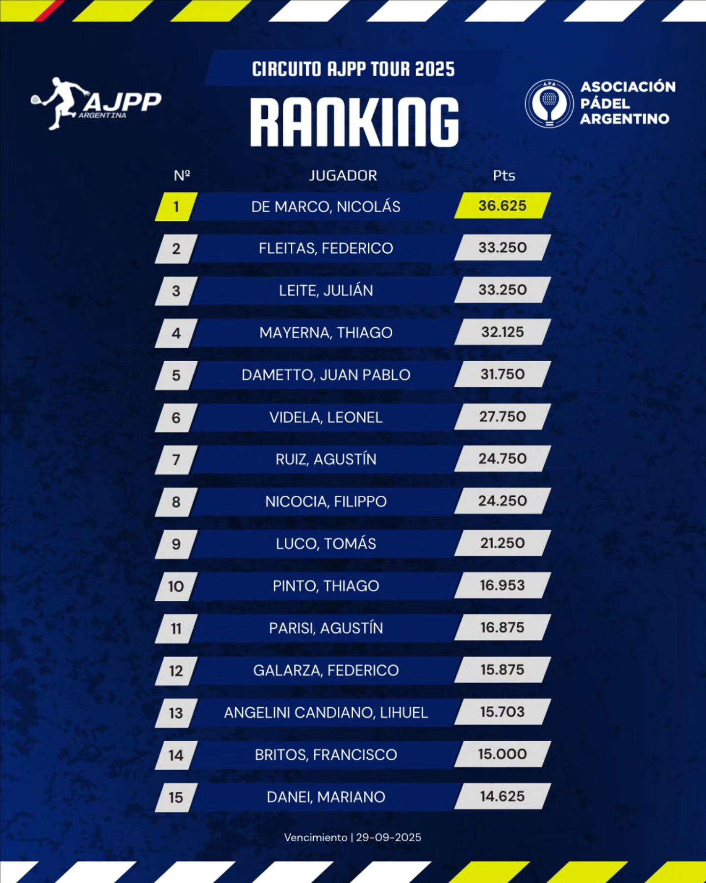 La Asociación de Jugadores Profesionales de Padel dio a conocer el Top 15 de lo que va del año y el chascomunense Thiago Mayerna se encuentra en el cuarto lugar del ordenamiento y su tío, Leo Videla, en el sexto.