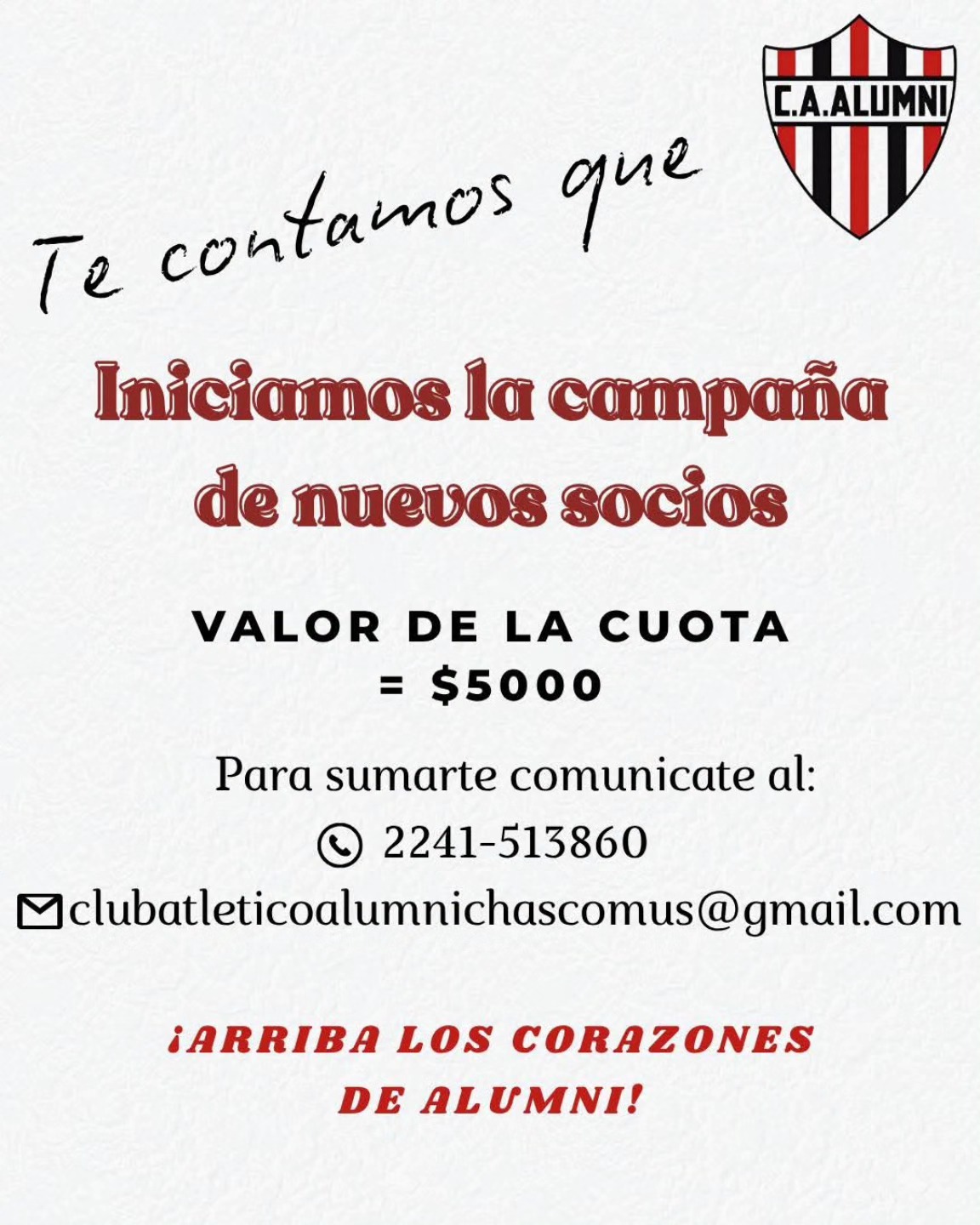 Club Alumni de Chascomús comenzó una campaña de nuevos socios, luego de la recuperación del mismo. A través de sus redes sociales invitan a los chascomunenses a unirse para seguir creciendo.