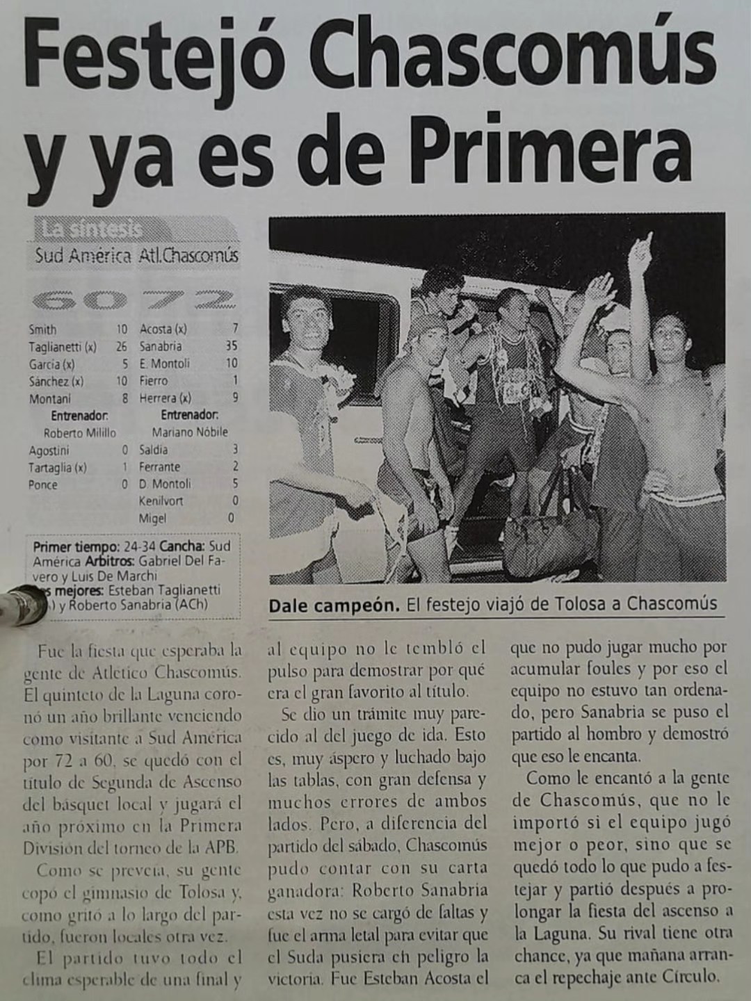 Roberto Sanabria, hoy el coordinador de selecciones de La Plata, era el líder de la ofensiva y una muestra gratis de eso son los 35 puntos que esa noche marcó en Tolosa. El pivote titular era el Negro Herrera (todavía vigente y jugando curiosamente en el Suda) y también jugaron los mellizos Montoli, Gonzalo Fierro, Esteban Acosta, Alejandro Saldías y Ramiro Ferrante, que ayer nomás acaba de finalizar su mandato como concejal en la ciudad. Los dirigió Mariano Nóbile y tras el corte de redes metieron una caravana memorable de regreso a la Laguna. Porque después hubo otros festejos, pero ése tuvo el sabor inigualable del de la primera vez.